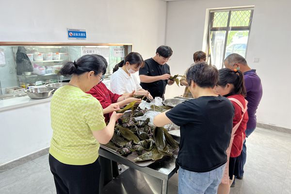 在活动现场,食堂工作人员把提前泡好的糯米、粽叶、馅料以及包扎的线绳、剪刀等辅助材料整齐地摆放在桌子上,为包粽子提前做好准备工作。食堂工作人员手把手传授不会包粽子的人员,折粽叶、放糯米、加蜜枣、裹扎绳,动作麻利、一气呵成,干部职工踊跃参加,现场欢声笑语不断,大家都十分享受包粽子的过程,经过两个小时的努力,馅料变成了一个个饱满的粽子,以粽传温情,以粽营造浓厚节日氛围。